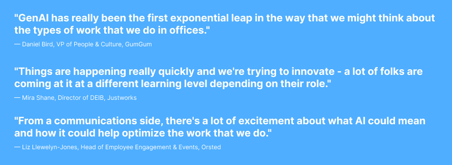 Leaders also pointed to the role of community in driving adoption. ERGs are helping employees engage with AI in more trusted, low-pressure environments, sometimes even seeing higher adoption. Alongside this, there’s growing excitement around AI’s potential to improve day-to-day work. As Liz shared, “From a communications side, there's a lot of excitement about what AI could mean and how it could help optimize the work that we do.”