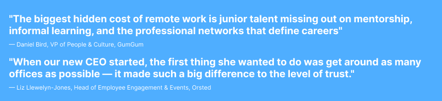 As work becomes more digital and AI-driven, leaders are seeing more clearly what’s lost when people aren’t physically together. One of the biggest gaps is around learning, mentorship, and relationship-building. As Daniel Bird put it, “The biggest hidden cost of remote work is junior talent missing out on mentorship, informal learning, and the professional networks that define careers.” In other words, some of the most important aspects of career growth are built through everyday, in-person interactions that are difficult to fully replicate remotely. These moments of learning and connection are difficult to replicate remotely.