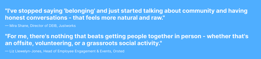 There’s also a shift in how leaders are talking about this. As Mira Shane said, “I’ve stopped saying ‘belonging’ and just started talking about community and having honest conversations, that feels more natural and raw.” The focus is moving toward creating more authentic, honest spaces for connection that can scale more naturally across teams and geographies.